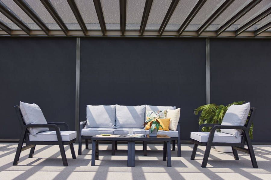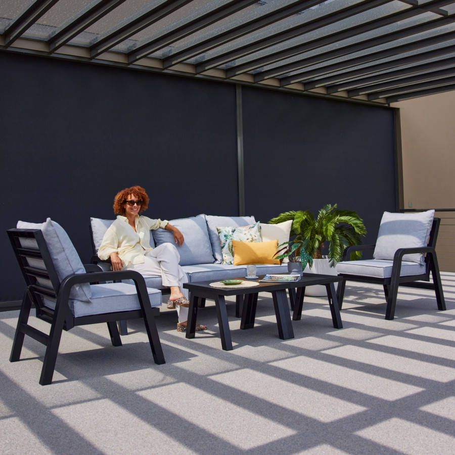 Deze 3-zits loungeset heeft een uniek design. De set is van lichtgewicht en het frame heeft een antraciet kleur. Er zitten comfortabele grijze kussens bij de set. De Ibiza sets zijn modulair.