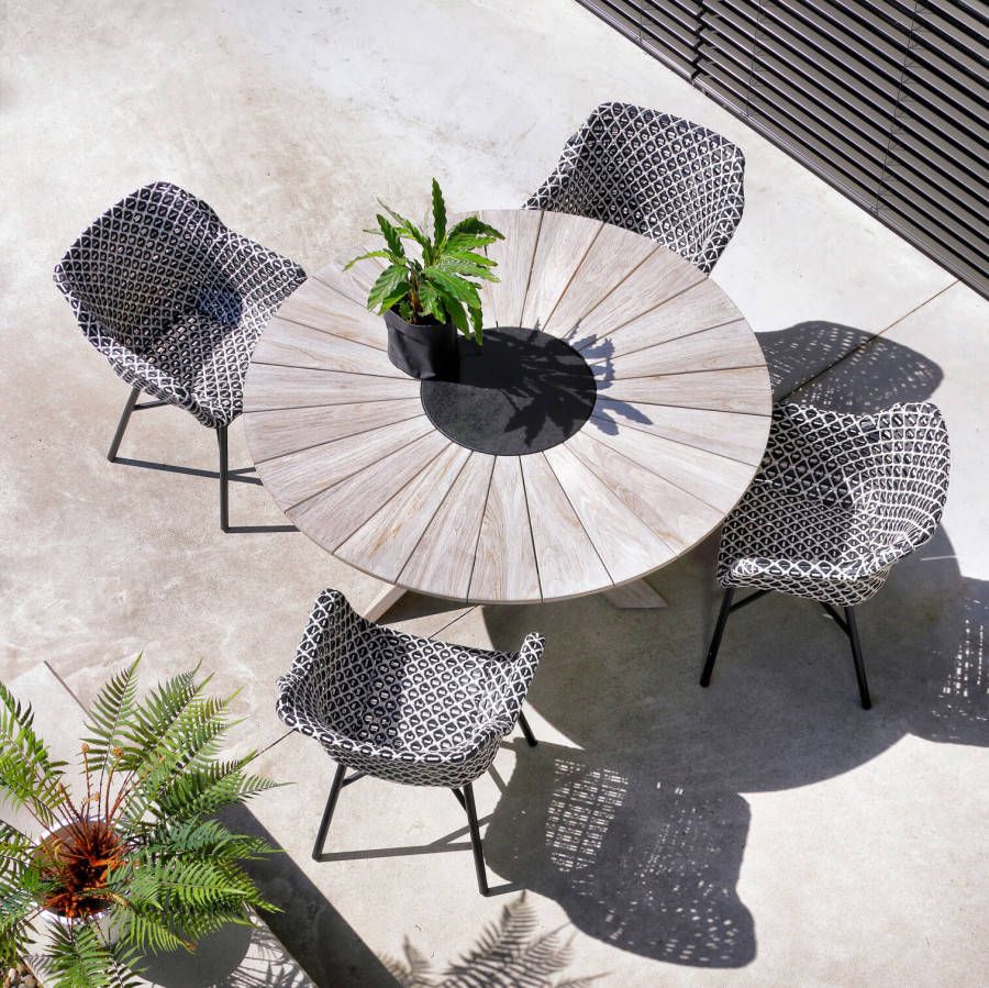 De Provence Crossleg is een grote ronde tuintafel. Deze tafel is geheel vervaardigd uit teakhout en heeft een robuust karakter. Midden in het tafelblad zit een granieten inlay. Hierdoor krijgt de Provence een moderne touch! Het gekruiste onderstel is super handig, hierdoor zitten de tafelpoten namelijk nooit de stoelen in de weg! Deze tafel kun je gerust het hele jaar door buiten laten staan.