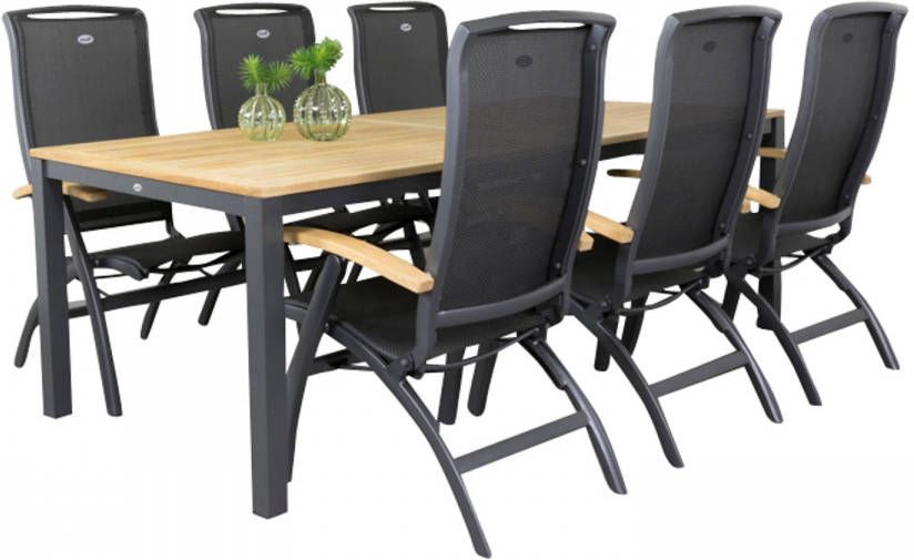 De set bestaat uit 6 stoelen en een tafel. Het is ook mogelijk om aan de kopse kanten van de tafel een extra stoel te plaatsen zodat er plek is voor 8 personen. De Hartman Da Vinci.