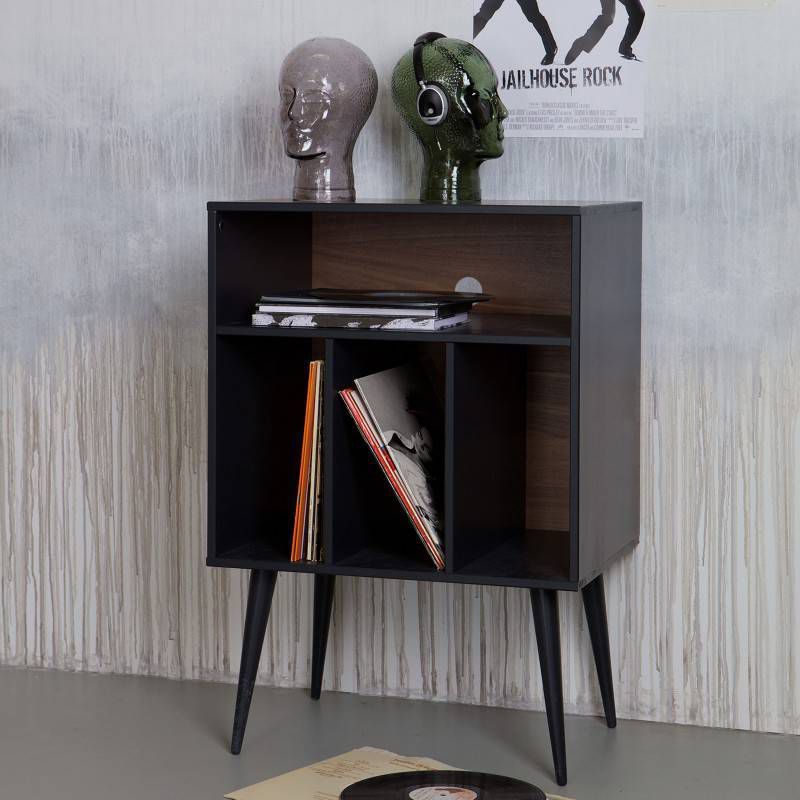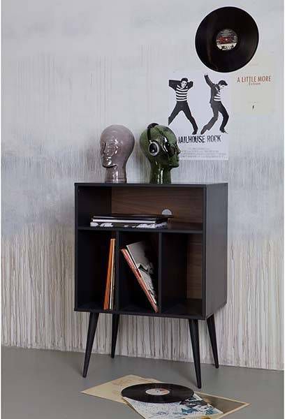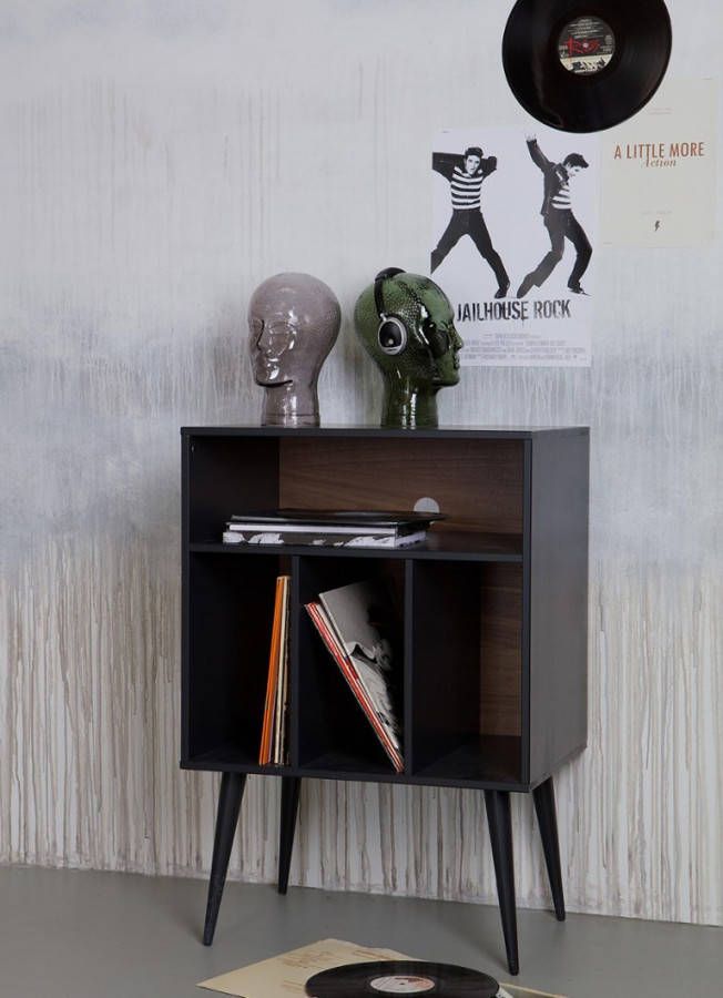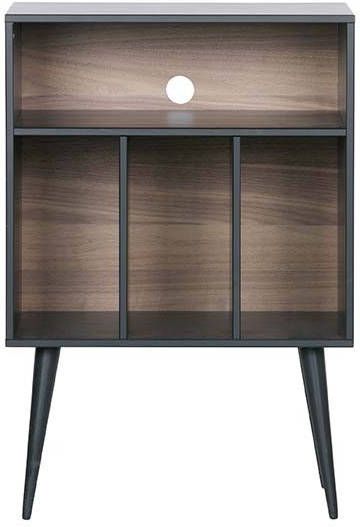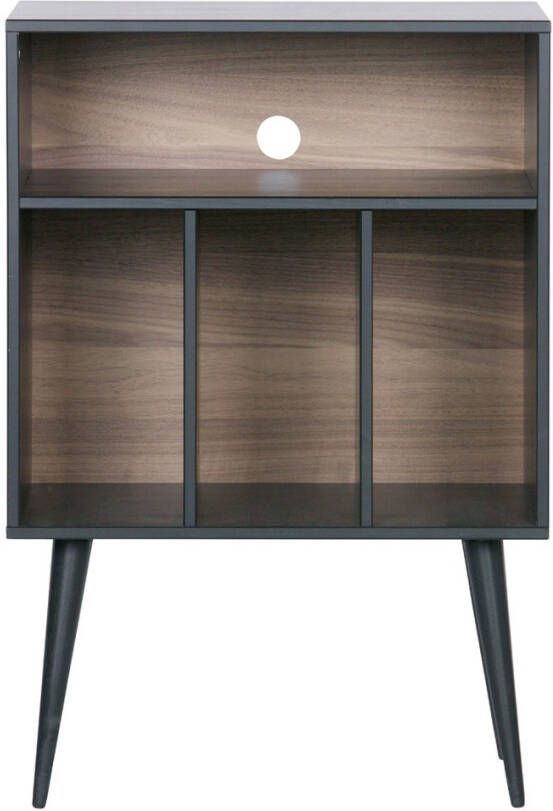 Kastje James noten/zwart van WOOOD is uitgevoerd in mat zwart gelakt grenen hout in combinatie met MDF noten fineer. In de vakken aan de onderzijde passen LP's. En in het brede vak bovenin zou een versterker passen. Maar het kastje is natuurlijk ook te gebruiken voor andere functies.